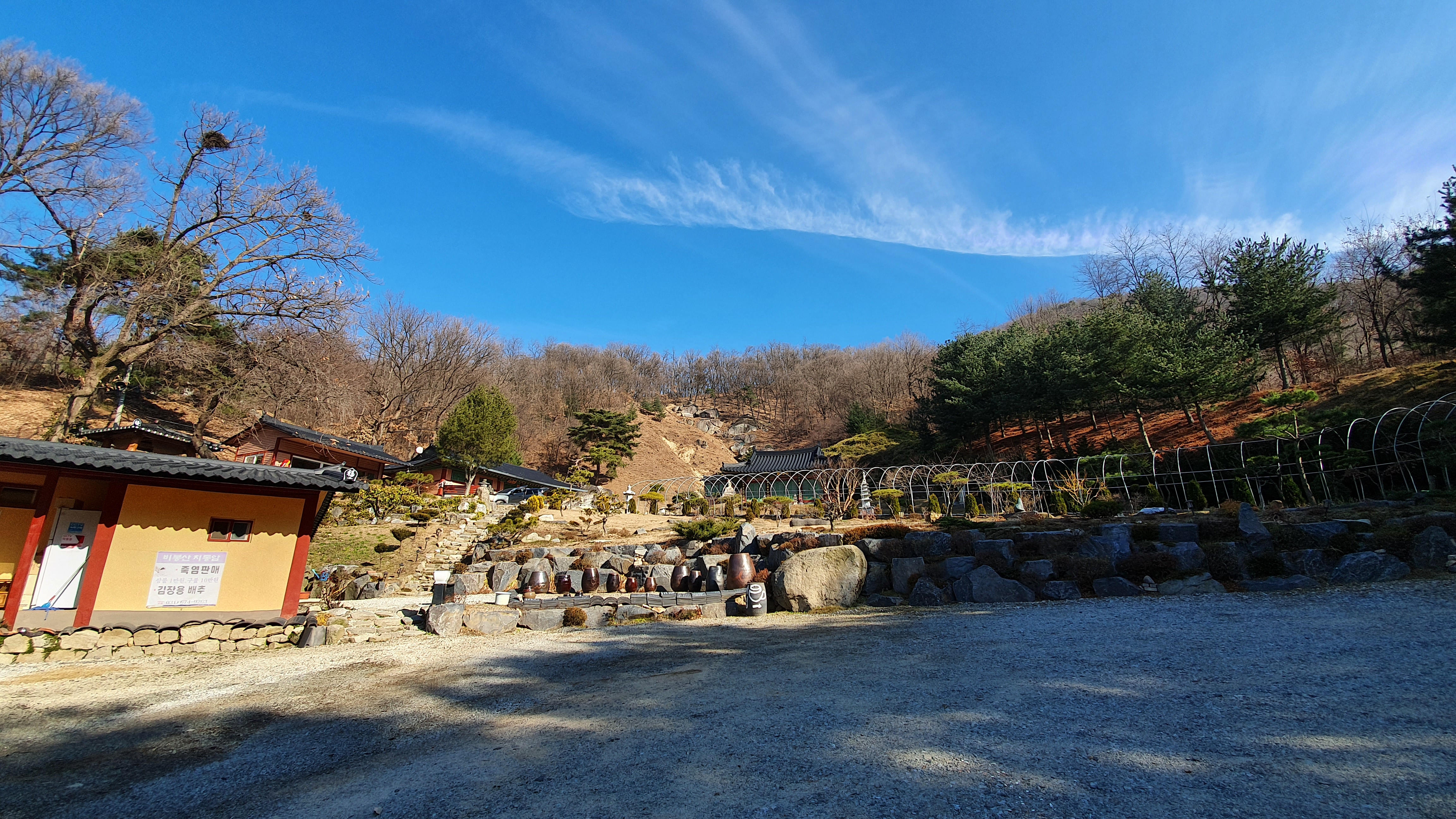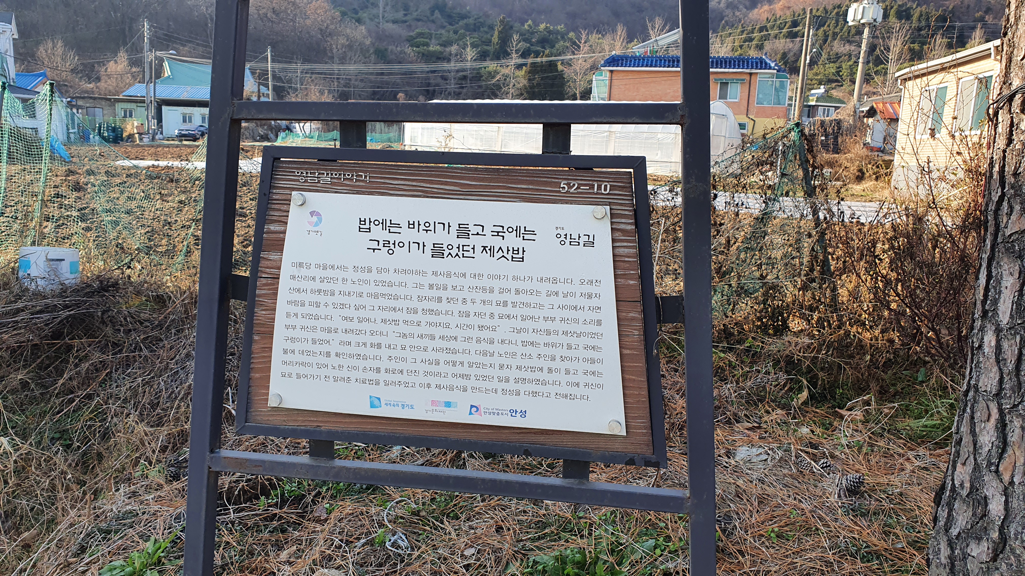 장평 삼거리 버스 정거장에서 10분쯤 걸어서 황새울 마을 도착