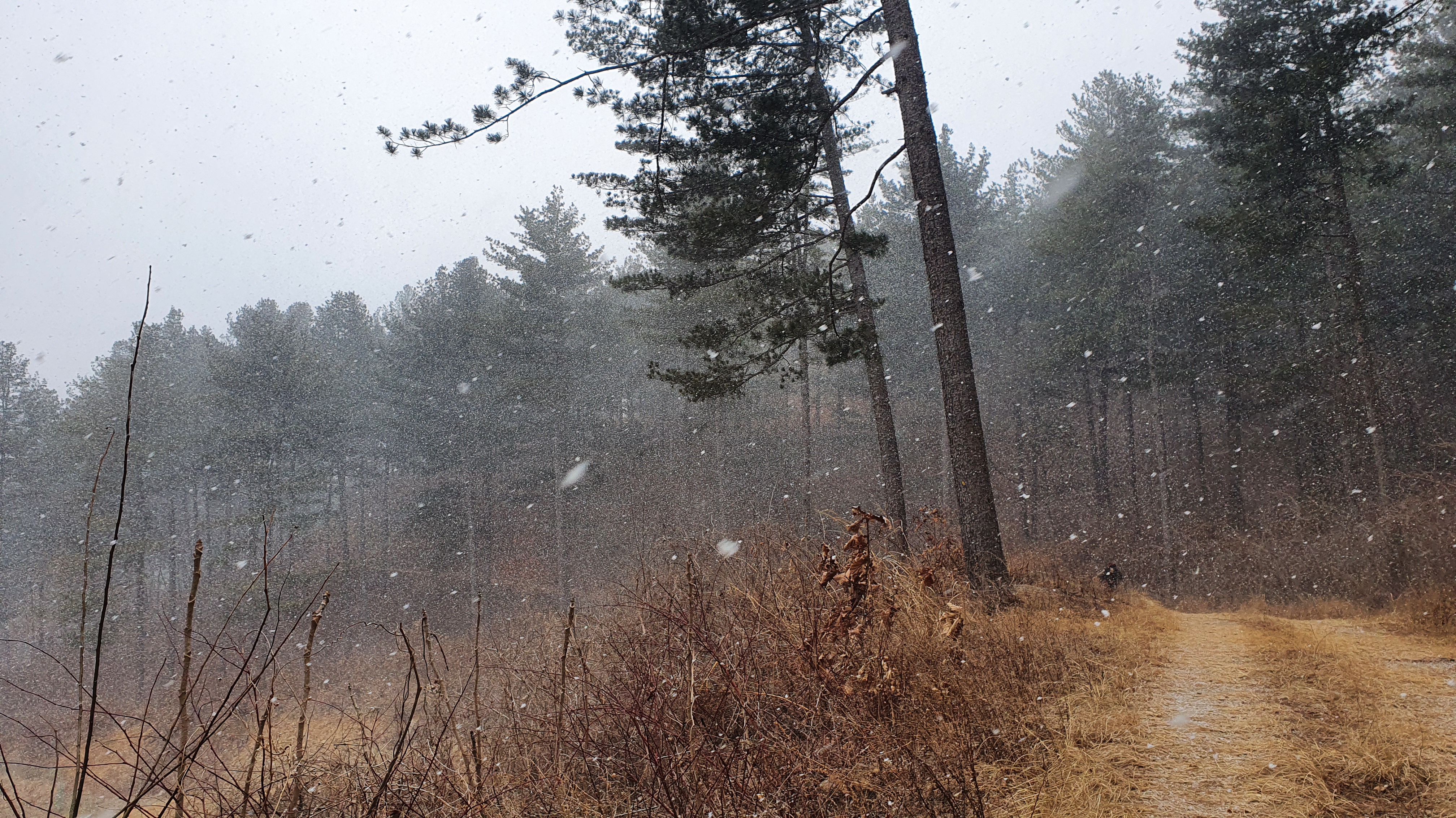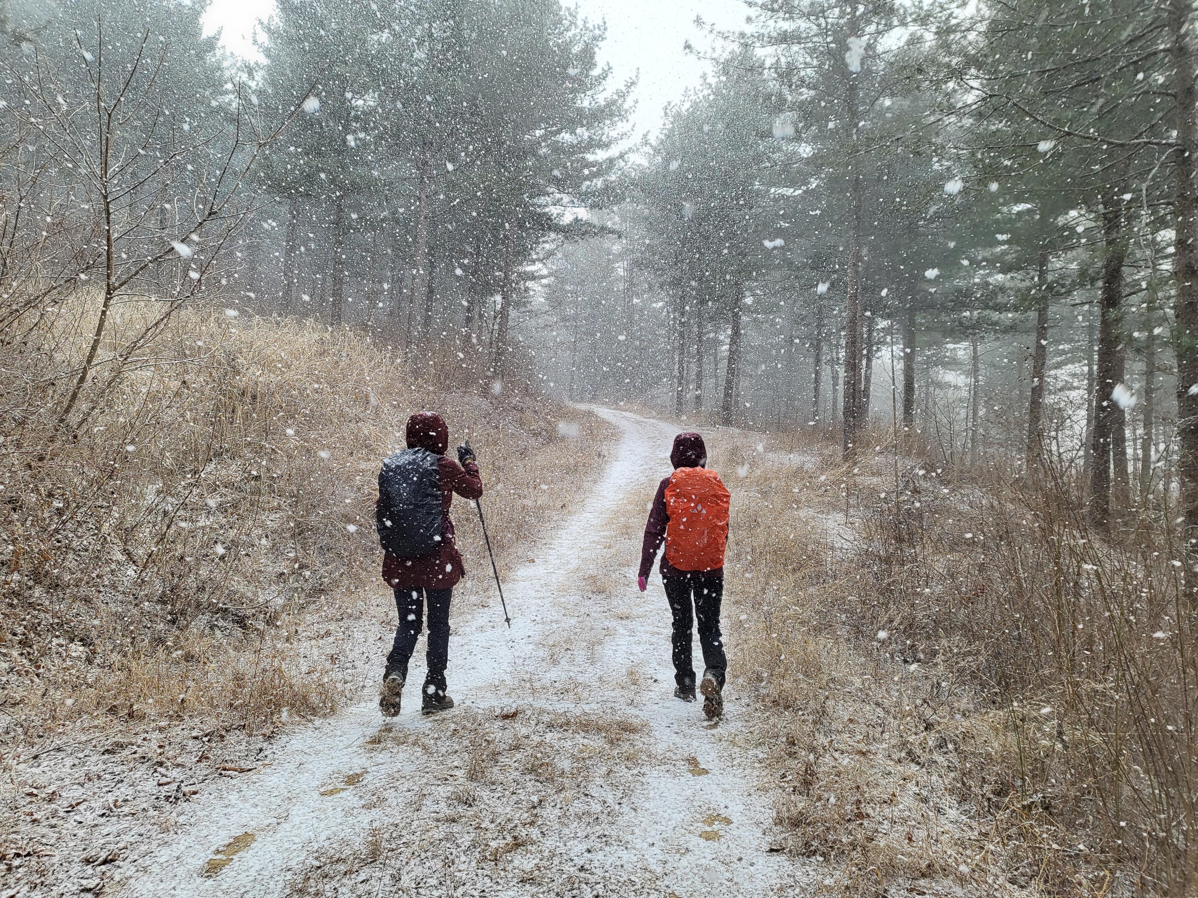 기차를 타고 가는 동안에 눈발이 날리기 시작한다.